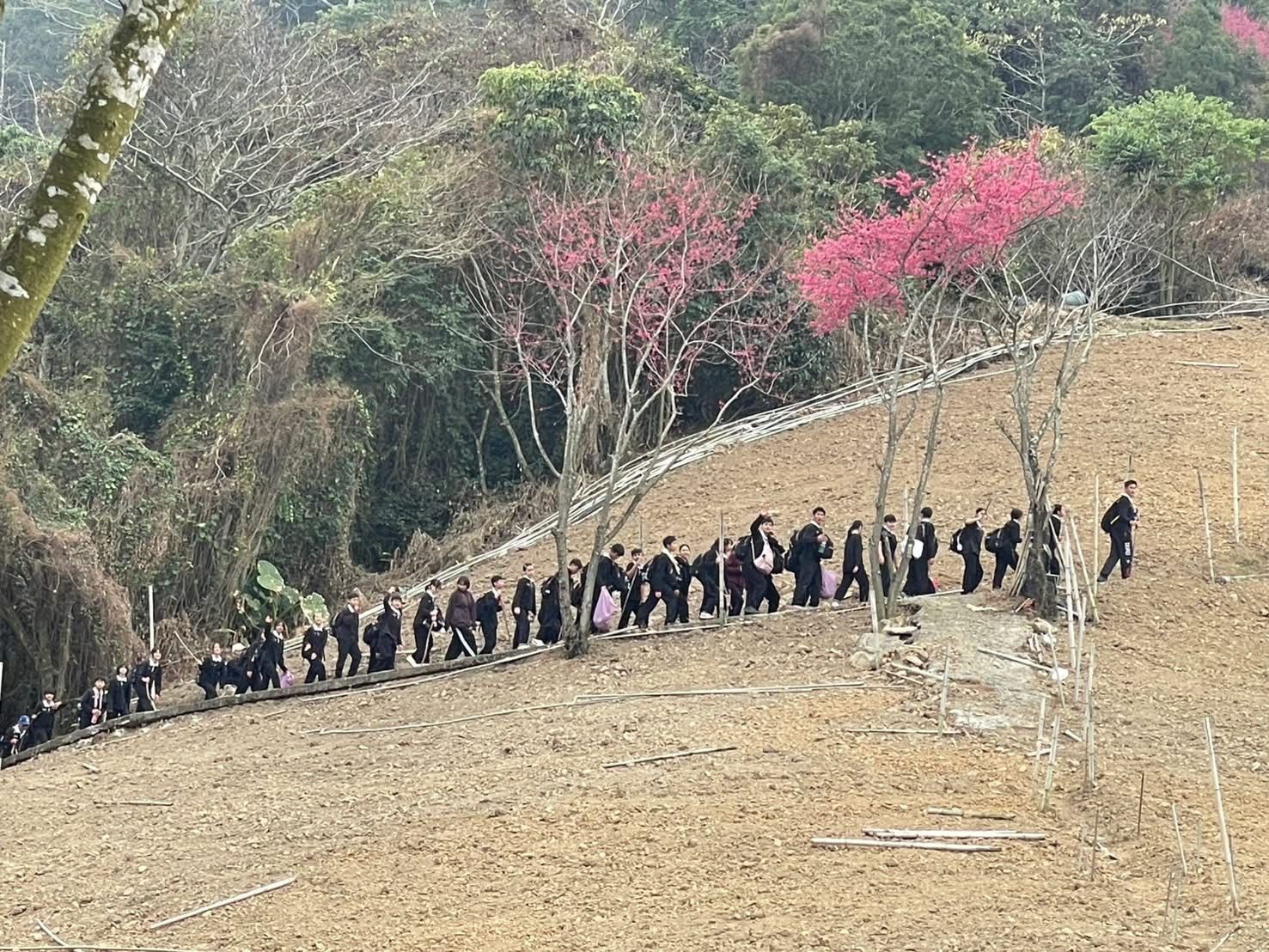 抵達望鄉部落後,彷彿上帝保守,天空漸漸放晴。暖身操結束,六至九年級組成的第一大隊率先出發,三至五年級緊接其後。陡坡、喘息、汗水,一步一步向上,也一次一次跨越心中的質疑。